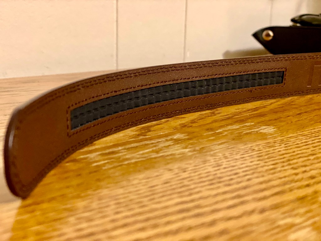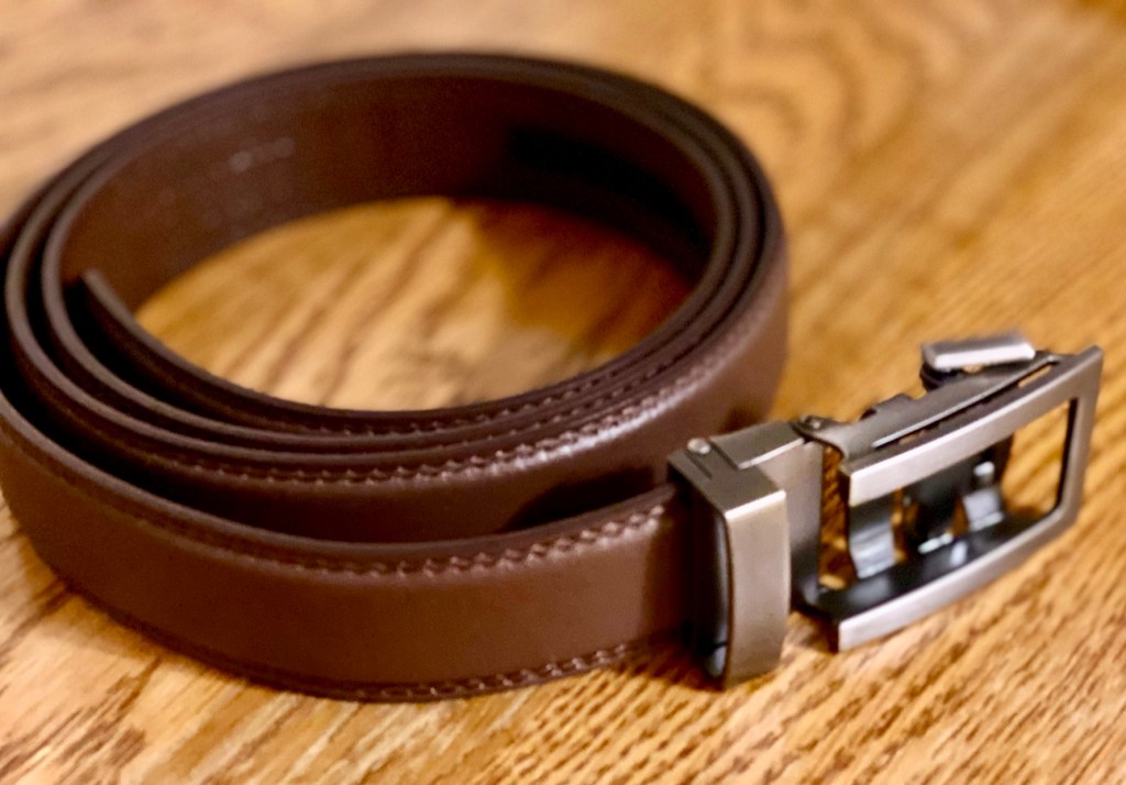 I chose the chocolate brown 1.25″ belt with a classic style buckle in gunmetal since I wear mostly grays, blues, and generally earthy colors, and those tones are easy to compliment with a muted brown.